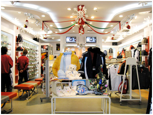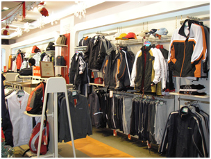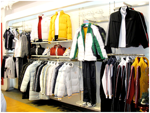 该店铺的商品布局为:进门的右侧为男、女服装,左侧为鞋区,中导后面为收银台。