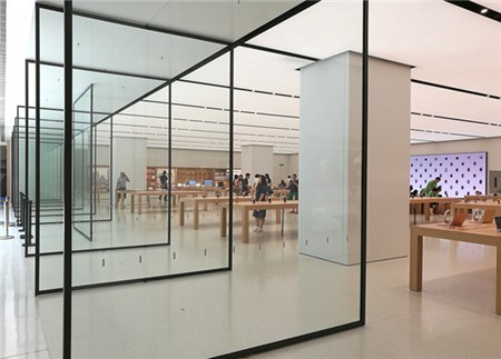 以零售门店设计著称的苹果店,在合生汇里设计了极为独特的隔板式透明敞开玻璃门设计,线条纵深维度,让科技型的零售门店充满未来感。