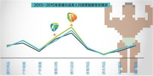 据京东大数据平台分析,从每位用户在各细分品类上的花费来看,骑行运动、健身训练成为人均消费额最高的运动项目。2014年每位用户在这两类产品上的消费指数,比2013年大幅提高了16.0%、10.3%,而基础类的体育用品等则下降了2.5%。