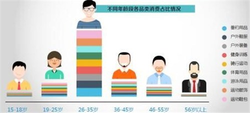 京东大数据平台显示,包括运动鞋包、运动服饰、体育用品、骑行运动、健身训练、户外装备、户外鞋服和垂钓用品等品类,26岁到35岁人群消费占比均在51%以上。