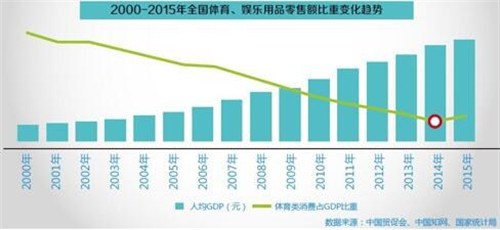但是,从2015年开始,体育消费回暖势头初现。 同期,人均GDP比2000年增长了5.2倍。按照国际通行标准,当人均GDP达到5000美元,体育产业会呈现“井喷”态势,目前中国人均GDP已到8000多美元的水平,但人均体育消费只相当于全球平均水平的十分之一,随着消费从生存型向发展型转变,未来体育消费潜力将更大程度释放。从2015年国产品牌市场情况来看,国产品牌呈现五分天下的格局,其中安踏、李宁、特步、361°和匹克,同期均实现了营收正增长,其中安踏突破百亿大关,李宁实现扭亏为盈,反映出行业整体走出调整期的特征。