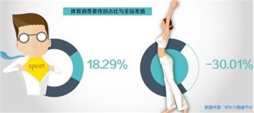 而据京东大数据平台资料显示,男性体育用户占比与全站男性用户相比,高出18.29%,女性体育用户占比与全站女性用户相比,低30.01%。由此可见体育类消费,男性相对女性更有体育消费习惯。女性运动消费潜力未被释放,体育电商可以尝试从多方面满足女性购物需求。