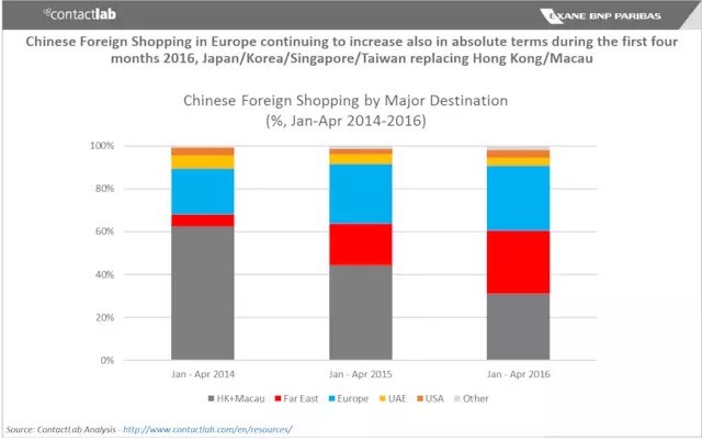 从地域上看,中国大陆消费者在欧洲、日本和韩国的奢侈品消费支出一直保持逐年增加。尽管近段时间欧洲频繁遭到恐怖袭击,但从销售数字来看他们的热情暂时尚未减退。而香港、澳门则失去了青睐——该地区在中国大陆消费者奢侈品购物预算中的比例从2014年前4个月的70%下降到了今年同期的35%。