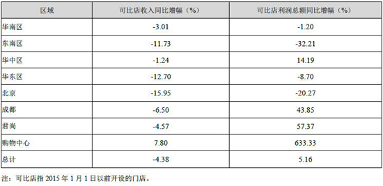 报告显示,各个区域可比店(2015年1月1日)的收入同比增幅整体呈下降趋势,仅购物中心有7.80%的增幅。而从利润总额同比增幅来看,整体增幅为5.16%,其中华中区、成都、君尚、购物中心均呈上升趋势,购物中心的利润总额同比增幅更是达到633.33%。