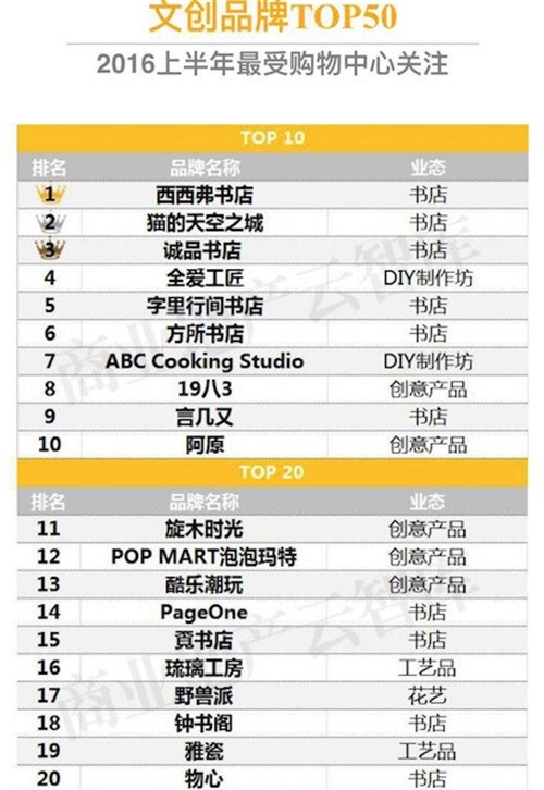 在一份《2016上半年最受购物中心关注的文创品牌》榜单中,西西弗、猫的天空之城、诚品书店排名前三,字里行间、方所、言几又、钟书阁等书店类业态也出现在前20名中。这些面积在100-3000平方米大小不等的书店类业态最近几年开始被购物中心注意到。