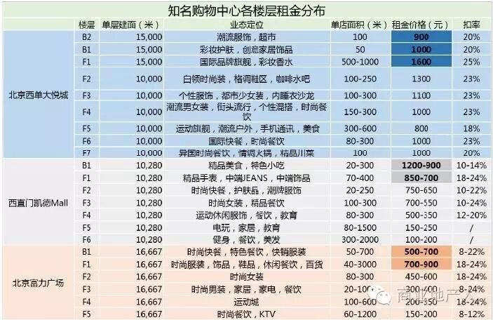 B1层租金在各楼层租金排序中属于次高位置,甚至某些商业B1层租金高于F1层水平。B1层租金对于商业整体租金的贡献率相对极高!