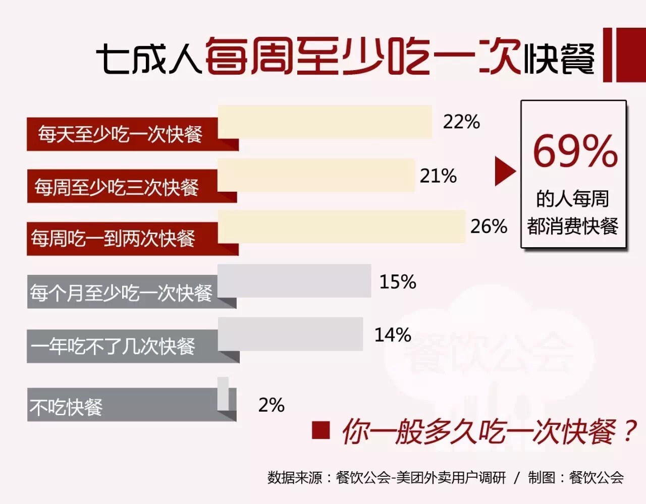 在我们的调查中,有22%的人表示他们每天至少吃一顿快餐,而每周吃三次快餐和每周吃一到两顿快餐的人分别占21%和26%。也就是说,69%的人每周至少会吃一次快餐。