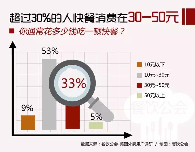 在人均消费上,53%接受调查的用户表示吃快餐的花费通常在10-30元,这部分人也是快餐消费的主流人群,他们的选择以中式简餐为主。
