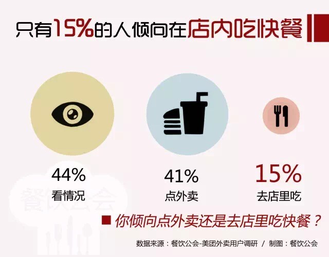 在所有餐饮业态中,快餐一定是被各大外卖平台改造最为彻底的一个。在我们的调查中,只有15%的人明确表示自己会去店里吃一顿快餐。只愿意点外卖的用户占41%,剩下的44%的人会看情况决定是否要去店内吃还是叫外卖。