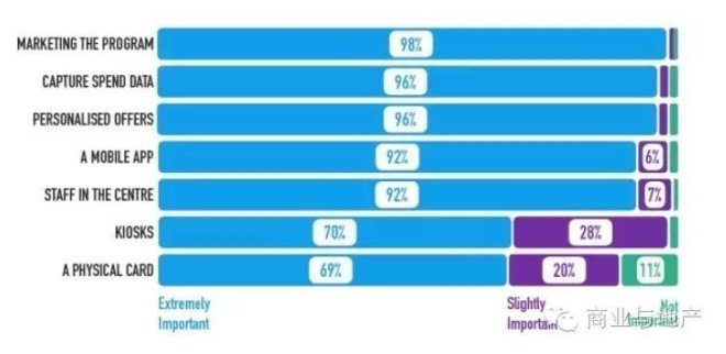 98%的受访者认为”会员计划的市场营销”是否具有影响力,对购物中心的会员计划能否成功最为重要。“获取消费数据”、“定制化具有吸引力的服务”也同样被认为十分重要,其次是设立有“移动app”和“有工作人员在现场宣传介绍会员计划”。