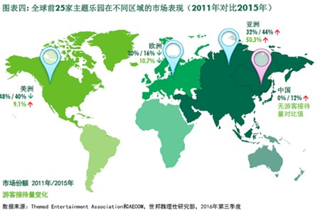 值得注意的是,在欧洲、美洲市场份额下滑的同时,亚洲地区的市场份额反而从32%提升至44%;在2011年~2015年中,亚洲地区游园人次增长50.3%,明显优于美洲的9.1%和欧洲的10.7%。