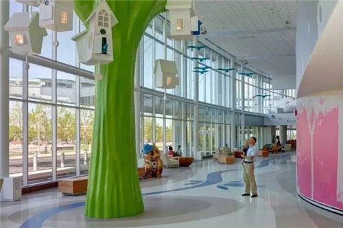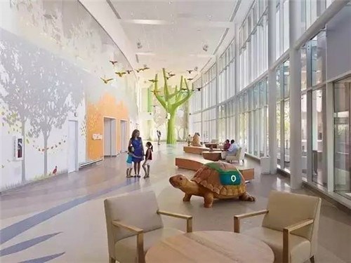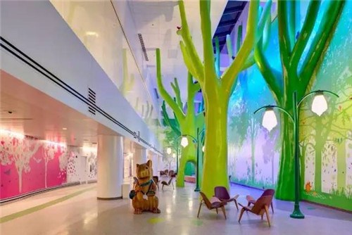 进入俄亥俄州Nationwide儿童医院,仿佛走进魔幻的动物森林——巨大化的树木、动物装置、墙壁上大面积的彩绘森林。而公共空间、墙壁、柱子,随处可发现动植物元素,又使得医院环境更加亲切、平易近人。