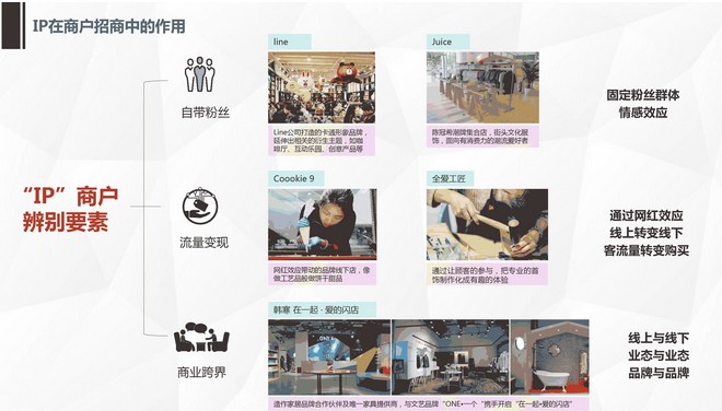 在利用IP进行商户招商的过程中,IP的主要作用是构建一个话题热点,实现商业的跨界,网络流量变现和粉丝情感效应。这些也是实现线上线下协同的重要节点。上海同道大叔咖啡店的开业,把网上巨大的粉丝流量变现,就是IP应用在商业招商中的一个现实例子。