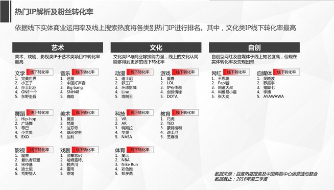 在对2000多个热门IP进行分析的同时,RET睿意德也依据各个IP在线下实体商业的运用率,再加上线上搜索热度,分门别类进行了IP转化率排名。结果发现,在当前情况下,文化类IP,比如动漫、游戏等,与实体商业的嫁接能力最强,能够得到更多的线下转化率;在艺术类方面,美术、戏剧、影视类IP转化率最高,比如莫奈、梵高就远比小王子更容易转化成线下的购买;至于现在非常热门的“网红”及自媒体,虽然在线上知名度很高,但现在实体转化率及变现其实并不容易。