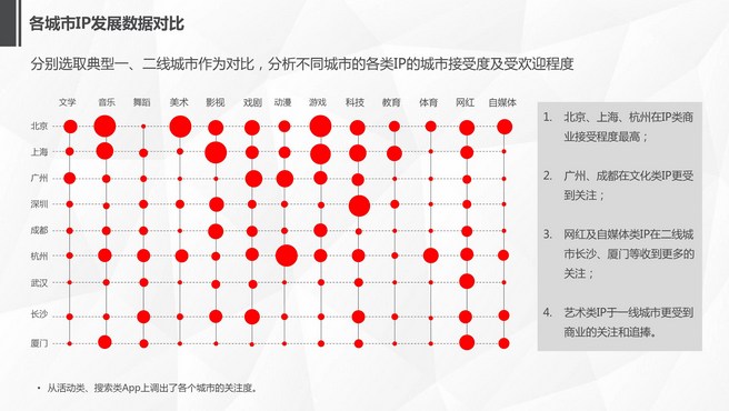 在进行IP分类对比的同时,RET睿意德也进行了分城市对比。分别选取9个不同的城市进行了分析,结果发现不同城市之间,对各类IP的城市接受度及受欢迎程度也是大不相同。由于互联网创业环境的发达和IT人口构成比例较高,北京、上海、杭州对IP类商业接受程度最高;由于当地文化生活节奏特性,广州、成都对文化类IP更受到关注;另外,网红及自媒体类IP在二线城市长沙、厦门等收到更多的关注,艺术类IP则于一线城市更受到商业的关注和追捧。
