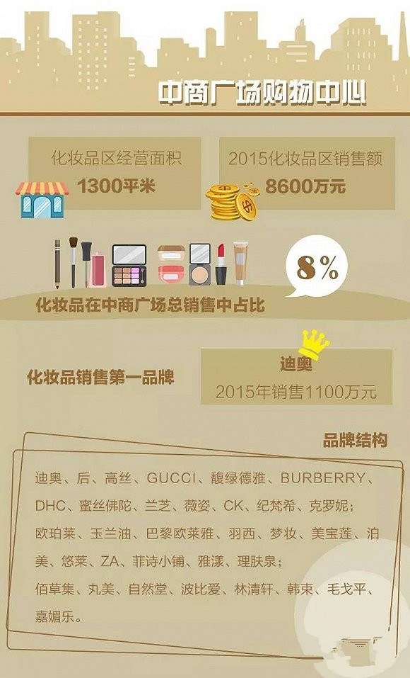 增加进口品牌的核心在于提高商场的聚客能力和坪效。进口化妆品品牌的聚客能力毋庸置疑,其坪效也高出其他品牌许多。以迪奥为例,38平方米的柜台为中商广场贡献了1100万元的销售额,相比15平方米销售200万元的品牌,在坪效上高出不止一倍。
