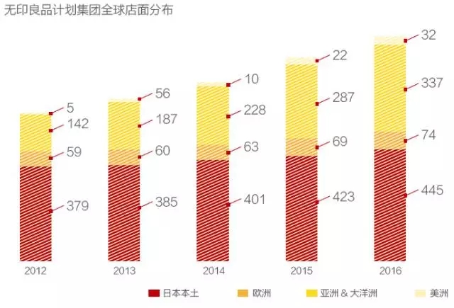 2006年后,中国商业综合体业态迅速崛起,无印良品与H&M、ZARA等快时尚品牌,享受了“中国红利”,而日韩文化在中国的流行、自身鲜明的品牌哲学,也便利了无印良品的扩张。截至2016年8月,“无印良品计划”全球开设362家门店,中国大陆占173家;2014财年、2015财年,中国大陆分别增设28家、32家门店,并计划2016财年新增43家,总数至203家。