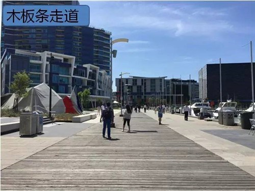 建议3:做户外商业走道部分可以用木板条铺设,通过颜色及材质的变化进行区域的分割。