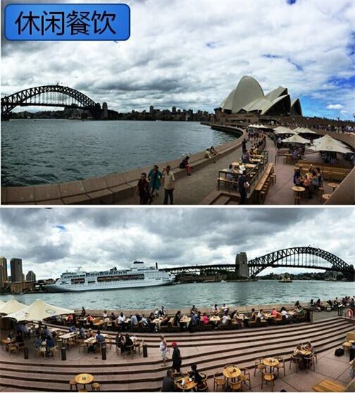 这里能够拍到悉尼歌剧院和海港大桥的全景,同时也是典型的沿海休闲餐饮,它有这么几个特色: