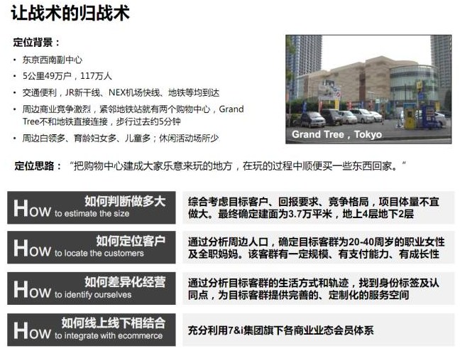 确定了项目战略之后,如何实施就是技术性问题了。根据项目地块的具体情况,来判断到底做多大合适?通过周边人口分析,确定有一定规模、有支付能力、有成长性的目标客群。通过目标客群分析,如何做差异化经营?最后,如何实现线上线下的结合?以Grand Tree为例: