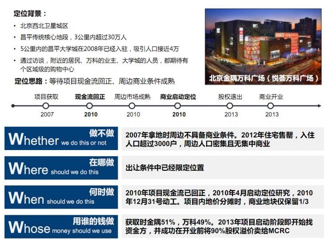 战略层面解决项目的大方向问题,包括拿到一块综合性用地时,决定做还是不做?在地块内哪个位置做?在开发过程的哪个阶段做?最后,用谁的钱来做?这是在项目启动之前需要确定的。以北京金隅万科广场为例(现已更名为悦荟万科广场)