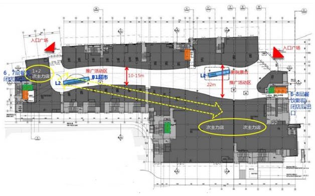 而且所有商户进入购物中心,不单独对外经营,共享人流;第三,可通过两端的次主力店和推广区拉动人员流动。比如北京住总广场动线就达150米,结合中庭及动线设置活动推广区,而且平面应尽量避免隐蔽的次流线,不易吸引人流。