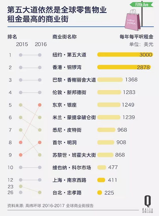 今年的这份报告也已经公布,竞争头名的还是纽约第五大道和香港铜锣湾。每年接近3000美元/平方英尺的租金价格,将其他商业街远远地甩开了。