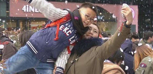 原本晴朗的天空中,突然飘下来一片片雪花,人声鼎沸的现场变得更加闹腾。尤其是带着孩子的市民们,纷纷拿起手机,为宝宝留下精彩的瞬间。