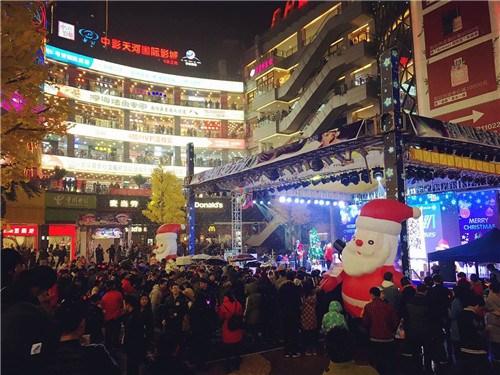 光谷步行街连续9年举办圣诞季主题活动,今年平安夜分别在一期下沉广场、四楼MVP中庭一直到三期德意风情街柏林广场全部布置了全天候舞台活动,尽管天公不作美下了小雨,但夜晚八点举办的光谷潮酷荧光趴活动等活动仍然人气爆满。