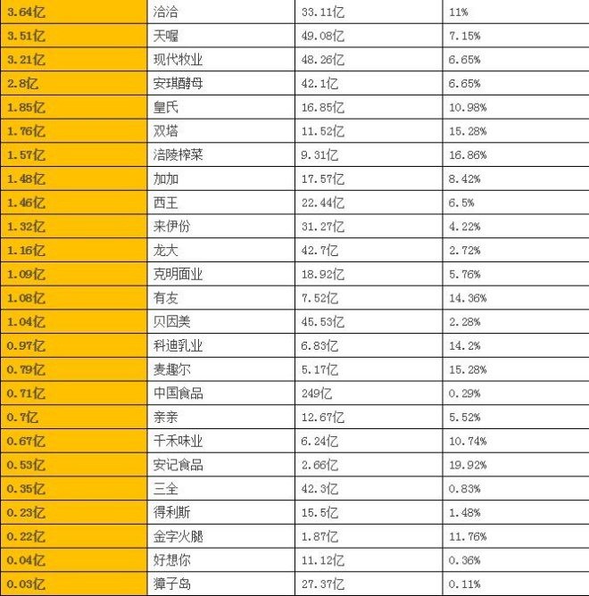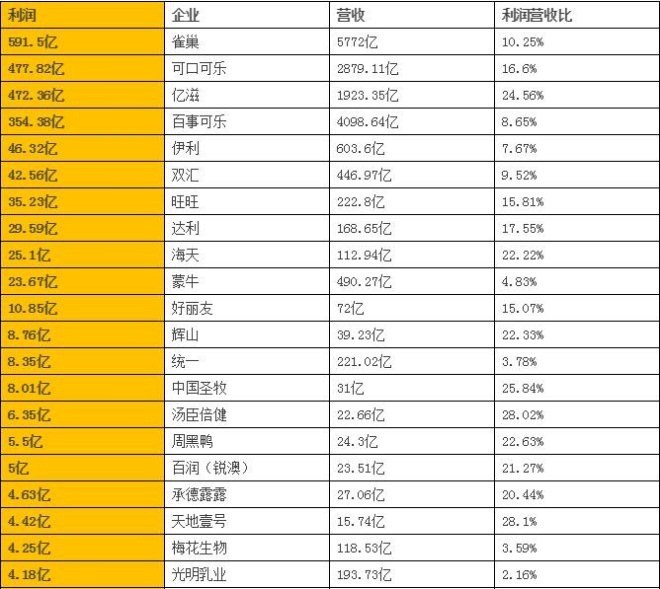 在这里也稍微拓展一下,看看整个食品行业的盈利能力。由于2016年尚未走完,这里取各家企业2015年的销售数据: