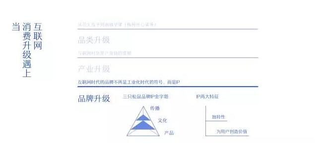 第三个是品牌升级,这个可能也是大家最感兴趣的地方。很多人说三只松鼠的营销做的好,广告植入做的好,但是并没有那么简单,我们自己内部提出了一个品牌IP金字塔的模型。也就是产品是基石,文化是驱动,传播是认知。我们常说产品要做到100分,就是对产品的极致追求,只有好的产品,才能成为这个企业的根基。中间这一部分是文化,在三只松鼠我们有很多比较独特的企业文化,比如说我们的1154行动纲领,还有我们的道德公约等等,这些文化才保证我们产品的品质。最后上面这一层就是传播,只有我们的产品机遇我们的文化,才有最后的传播,传播是认知。