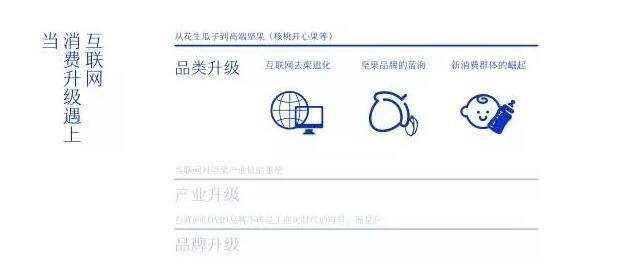第一个升级是品类升级。以前大家吃瓜子花生,现在更多的人会选择一些高端的坚果。品类升级大家都能够看得到,这背后会有三个渠道,超市、批发、沿街专卖店,很显然这三个渠道没办法在短时间形成一个全国化的品牌,但是互联网可以,互联网可以直达消费者。我们80%的消费者是85、90后,这代人有网购的习惯,对品牌有个性化的需求,所以我们把握住了这个趋势。