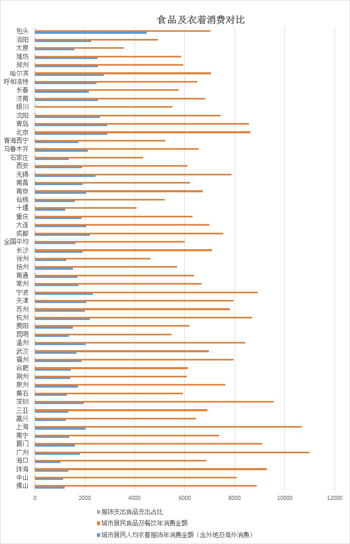 再从穿的人均消费占城市人均总生活消费支出比来看,十二大“最爱穿”的城市排名依次为:包头、郑州、潍坊、哈尔滨、太原、洛阳、青岛、重庆、南昌、呼和浩特、西宁、济南。对比十二大“最爱吃”的城市:三亚、厦门、荆州、温州、合肥、佛山、黄石、中山、深圳、福州、泉州、珠海广州(并列),两者完全没有重合,既爱吃又爱穿的城市难产。