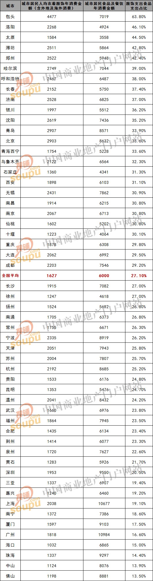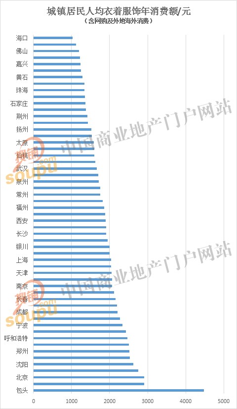 就消费绝对金额而言,大陆城市中人均穿的消费(包括各类衣帽鞋)最高十大城市依次为:包头、青岛、北京、哈尔滨、沈阳、济南、郑州、潍坊、呼和浩特、无锡,其中前九个城市均位于北方,而宁波、洛阳、成都、杭州、长春、乌鲁木齐、南京、大连、天津、温州、上海、苏州等重点城市虽然年均衣着消费超过2千元但屈居11至22位。前22个城市中15个城市位于长江以北,多数更是位于黄河以北。