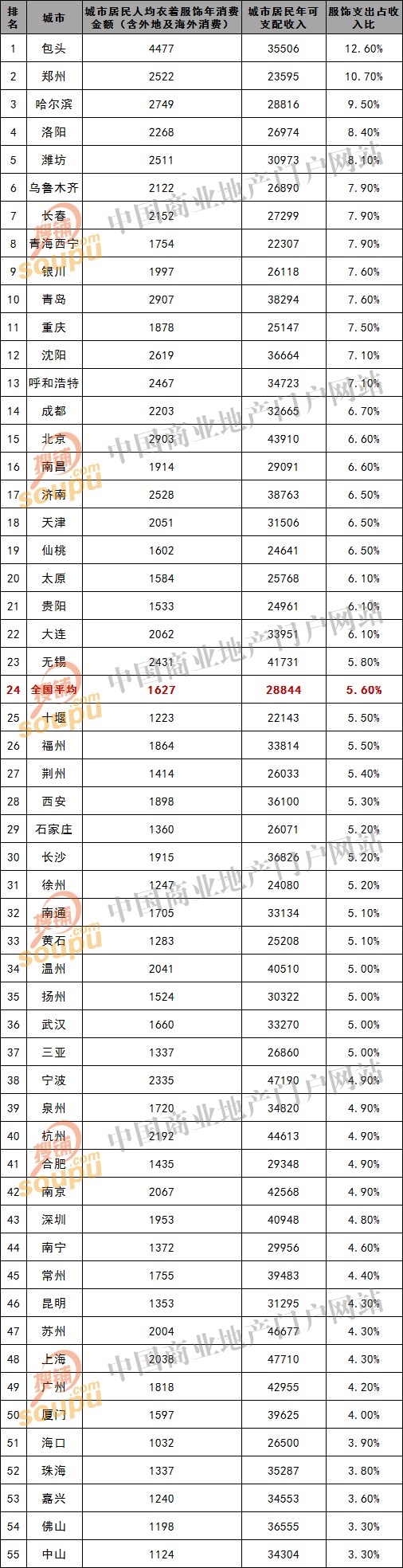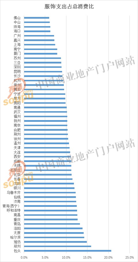 由于气候因素东北和华北西北当仁不让地夺走了十二个席位,其中北京虽然人均服饰消费2903元位居全国前三,但由于更多的文化娱乐消费支出,故穿的消费占个人总消费比重仅居第十八。西南则有重庆成都入围,富裕的江浙沪地区仅有无锡一座城市入围且排名在20强中垫底,华东另有潍坊、青岛、南昌、济南晋级,华中有郑州、洛阳、仙桃入围。