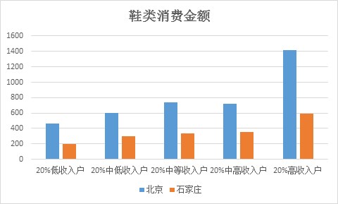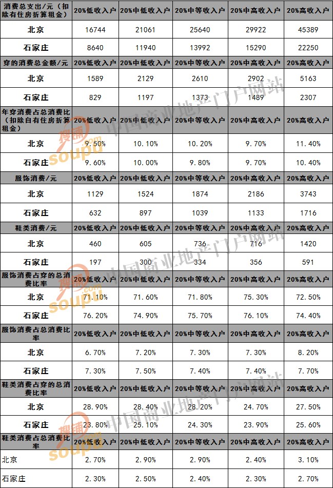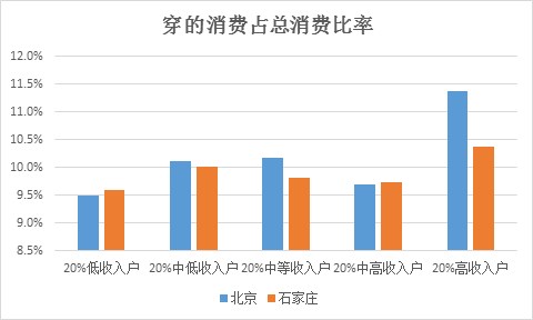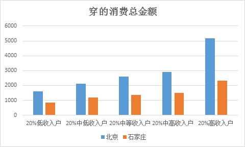 即便是同一城市内不同收入水平人群的穿的消费习惯也大不相同,我们以北京和石家庄年鉴五组收入人群为例,对其穿的消费差异性进行对比。