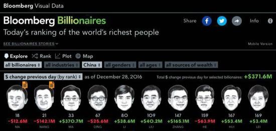 2016年,中国富豪创造的财富出现下滑,为彭博亿万富翁排行榜启动5年来首次。由于2016年沪深300指数下挫以及人民币兑美元贬值近7%,中国富豪的财富总体缩水110亿美元。