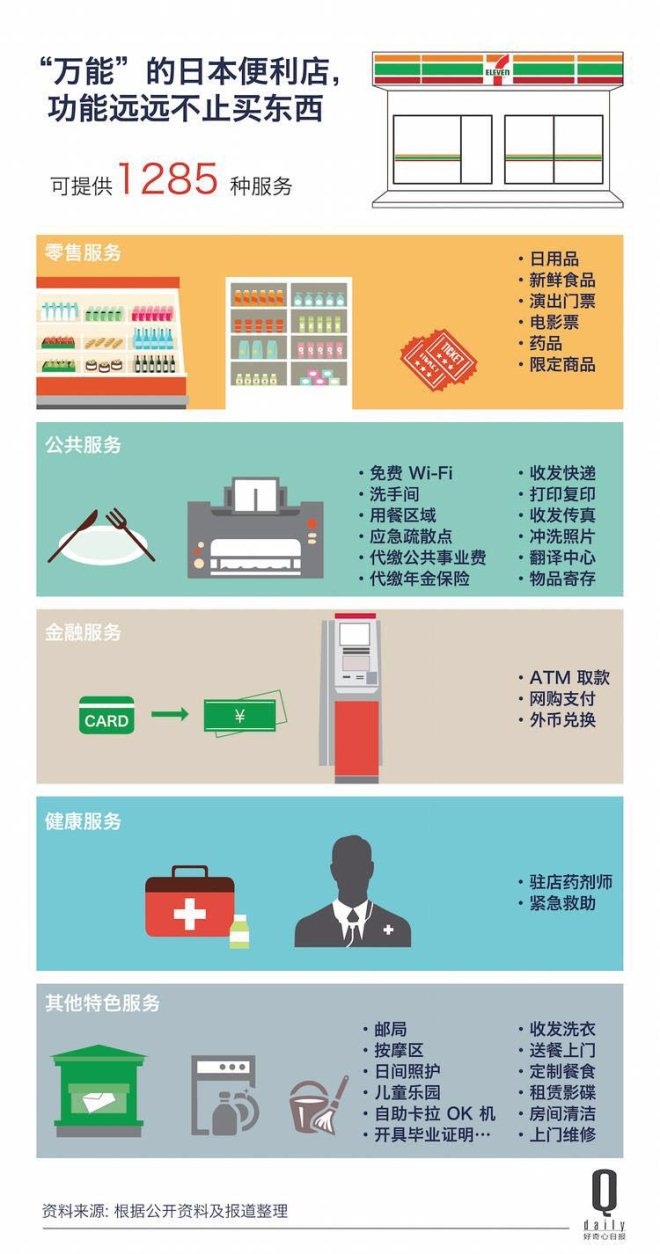 按照全家便利店所属顶新集团便利、餐饮事业董事长魏应行先前的说法,之所以日本便利店能够在如此激烈的竞争中依生存,是因为它们可以提供的服务种类多达 1285 种。而目前,中国的便利店通常只提供 50 种服务。