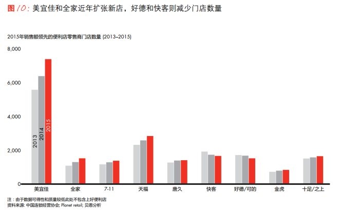 上图可以看到,在2015年销售额最高的前十大便利店中,像是美宜佳、全家、7-11、天福等便利店品牌在过去几年都在进行门店扩张。