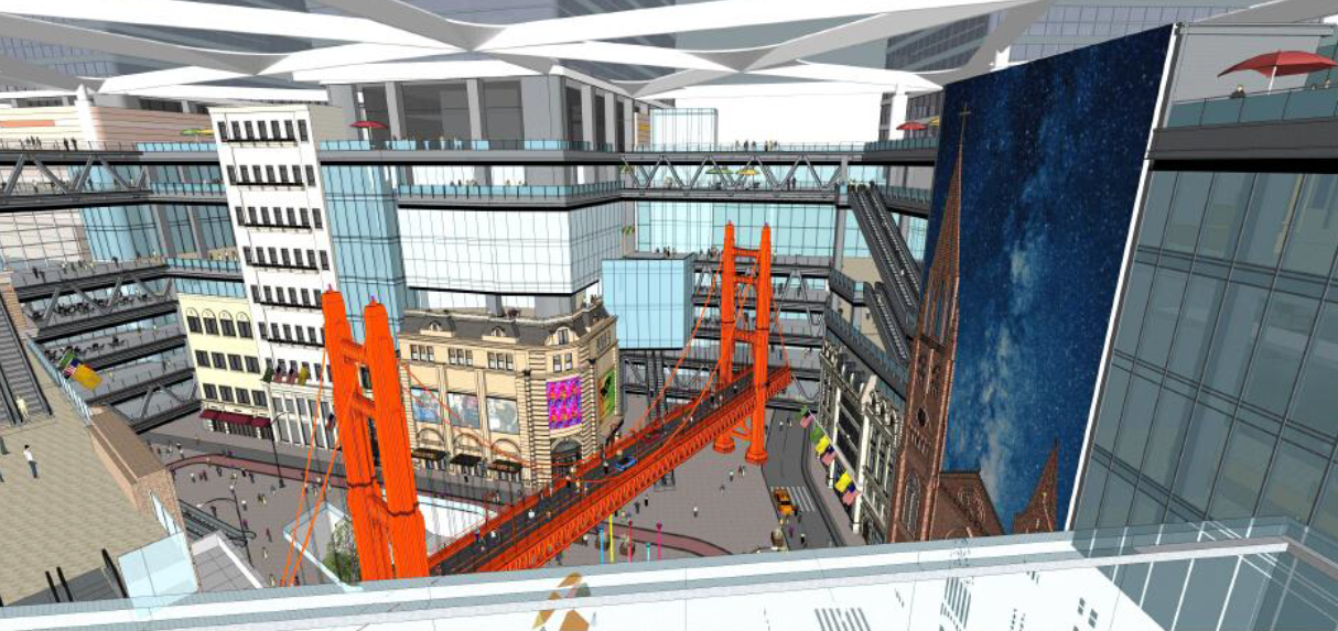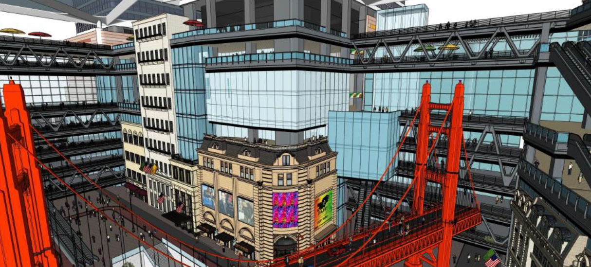 内庭院入口以美国金门大桥为模型设计,而内部空间则模拟美国曼哈顿第五大道主题街区,并采用索桥的形式加强内部步行交通,商场的异国风情在此得到升华,一步一景,是昆明最佳拍照取景场所。