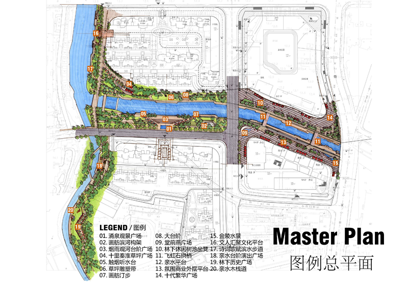 以金粉荟萃和十代繁华为例,金粉荟萃的布置以水为主题,有镜面雕塑水景、特色涌泉瀑布、水岸活动平台;十代繁华的功能以聚会为主,布置了林下聚会休闲、缤纷互动河岸、商业活动广场和外摆空间,以及大型主题雕塑。