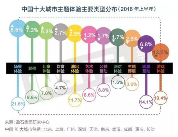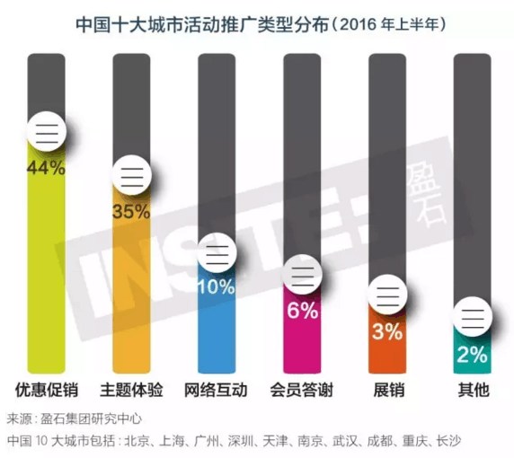 2016年上半年,场景体验类活动重拾“头把交椅”,其比重环比增长8.5个百分点至21.6%。根据盈石集团研究中心数据显示,在场景体验类活动中,超过20%均采用卡通或电影形象作为活动主题。此种方式不仅能吸引由儿童驱动的家庭消费群体,也能引入崇尚新鲜潮流的年轻群体,扩大购物中心对消费客群的辐射范围。而2015年表现优异的明星互动类活动继续“发威”位居第二,占比为14.1%。其中,明星多以电影见面会的形式与粉丝或消费者进行互动,其比重占全部明星互动类活动的31.4%。明星的出场对其粉丝的吸引程度非常可观,无论是本地粉丝还是从外地赶来的粉丝,均可以在短时间内为购物中心带来极高的人流,增加人气。