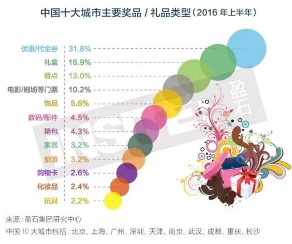 根据盈石集团研究中心追踪的数据显示,推广活动中所涉及的礼品或奖品总共涉及12大类,其中以优惠/代金券较为流行,占比达到31.8%。而餐点礼品的形式受到越来越多购物中心的青睐,增速最快,同比增幅上升了3个百分点。购物中心越来越注重不同业态之间的联动,特别是娱乐业态与餐饮业态互动,如武汉汉街万达推出凭餐饮消费小票满额即可获赠电影票一张等活动。不同业态之间的联动,可以将消费者在购物中心逗留时间延长,也能让热门业态带动冷门业态,实现购物中心整体销售额水平的提升。而上海大悦城更是推陈出新,与麦当劳合作推出大悦城摩天轮SKYRING泡泡乐分享餐,并在上海所有麦当劳餐厅销售。购物中心与连锁餐饮品牌的联动,将大大提升项目知名度,增加影响力。