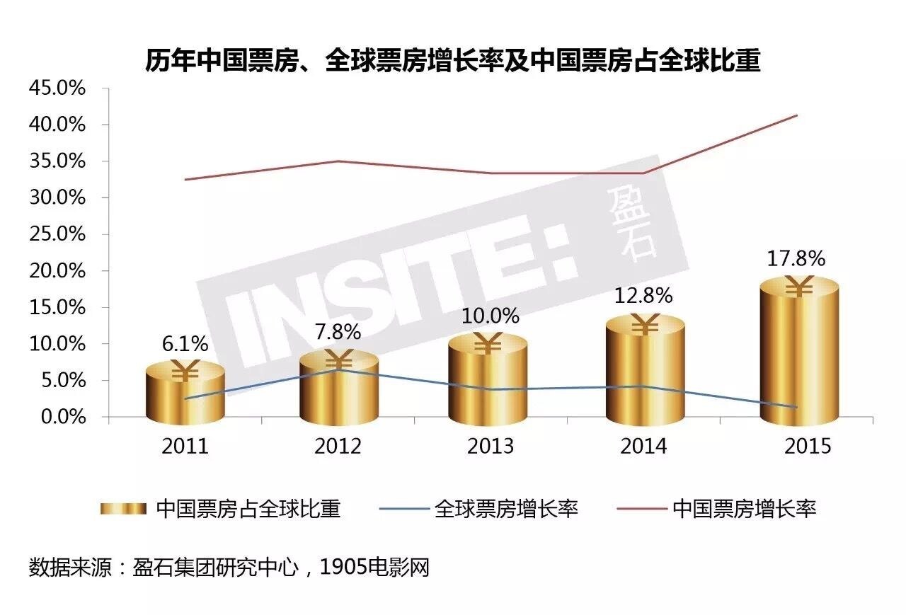 盈石集团研究中心根据1905电影网数据统计,2011-2015年中国影院票房始终保持每年三成以上的高速增长,年均增长率达到35.1%,远超同期全球影院票房3.6%的年均增长水平。并且,中国票房占全球比重也在不断提升,由2011年的6.1%攀升至2015年的17.8%,中国观影市场潜力突显。