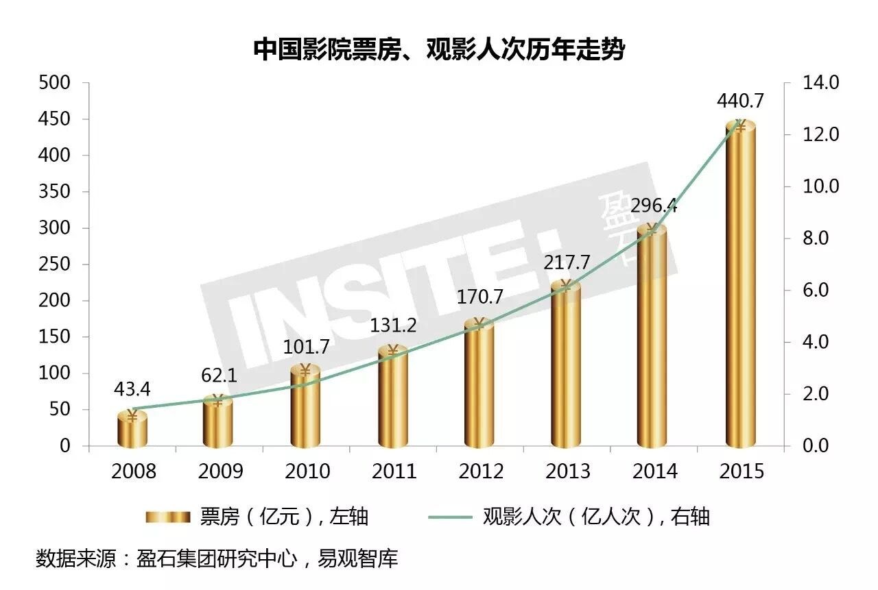 盈石集团研究中心根据线上消费研究机构易观智库数据统计,2008年以来中国影院票房规模以平均每年38.6%的速度增长,而观影人次亦达到年均增长率36.2%。其中,2015年票房规模440.7亿元,观影人次12.6亿人次,同比增长率分别为48.7%、51.6%,双双达到近五年来最高位,表现出强劲的观影需求。