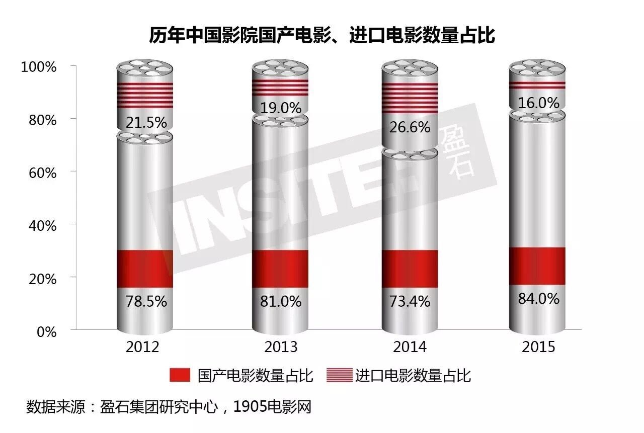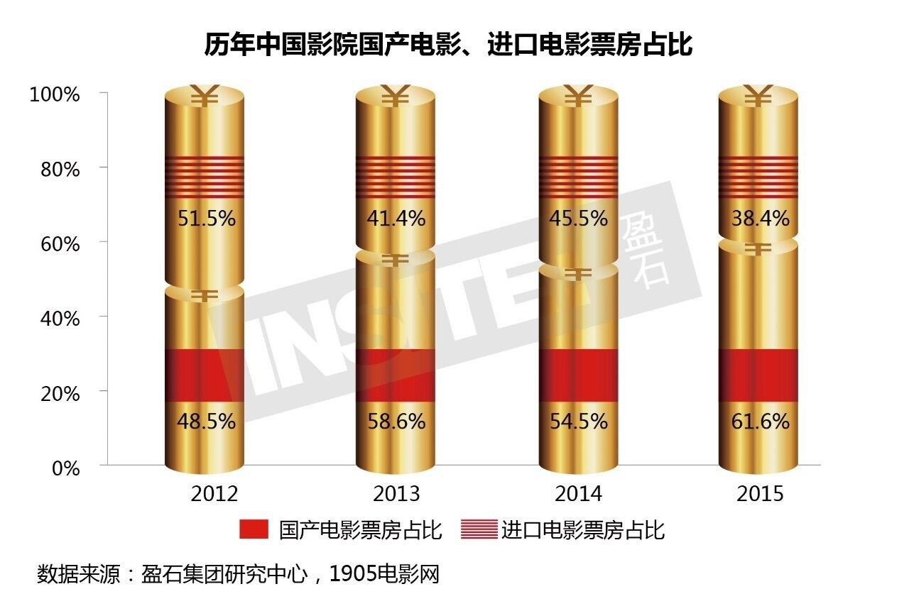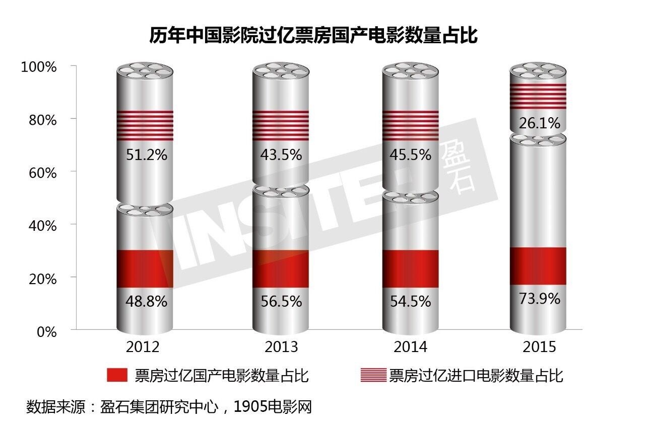盈石集团研究中心统计的中国市场票房过亿电影数量占比趋势也可以看出,国产电影占比从2012年的48.8%提升至2015年的73.9%,年均增长率达到15.9%,进一步突显国产电影在中国电影市场的优异表现。