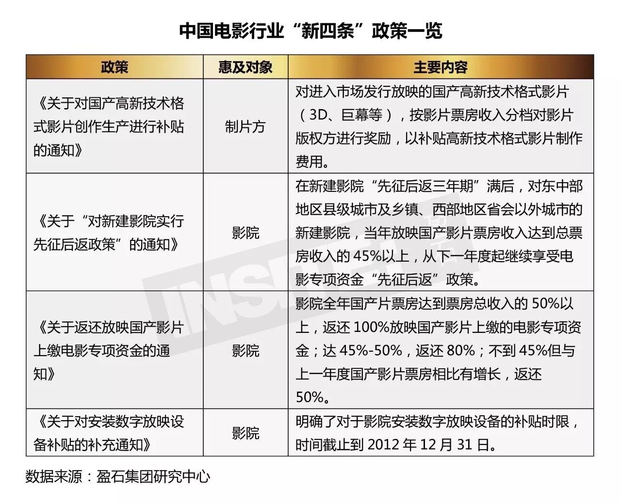 2012年11月,国家电影事业发展专项管理委员会公布了四项针对制片方和影院的资金补贴政策,被业内称为“新四条”。分别对制片方、影院进行了返还已上缴专项资金、按票房比例予以资金奖励等形式的资金补贴。
