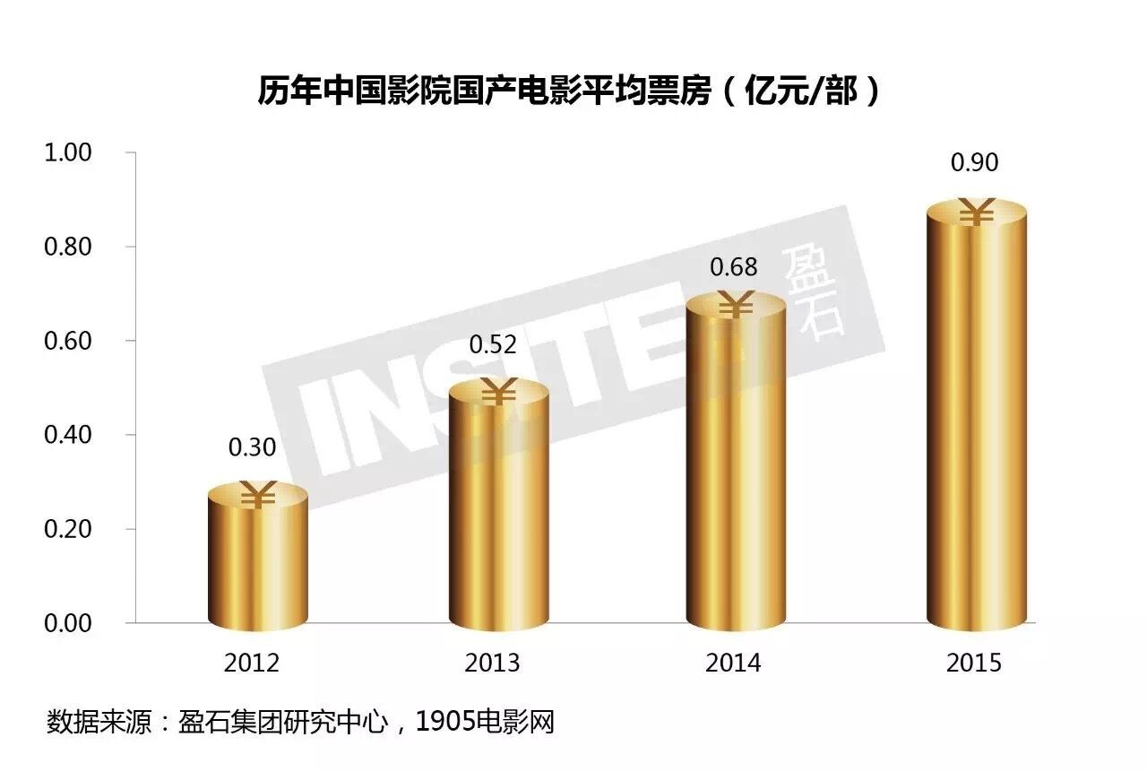 根据盈石集团研究中心统计,国产电影平均票房呈现明显的递增趋势,2015年国产电影平均票房达到0.9亿元/部,是2012年的3倍之多。