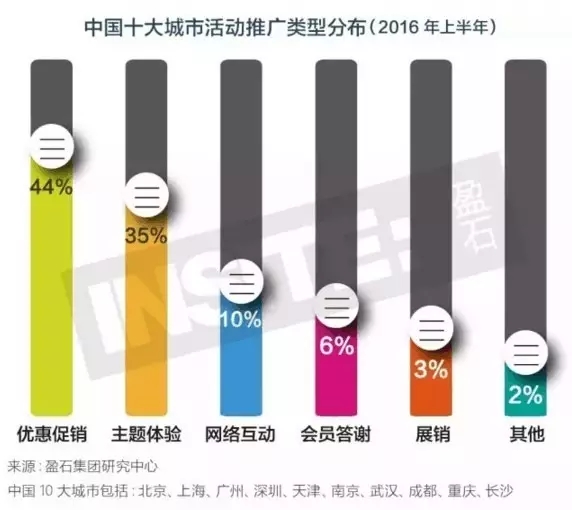 根据盈石集团研究中心持续监测数据显示,2016上半年全国十大重点城市标杆项目中,优惠促销及主题体验依旧稳稳占据推广活动的前两位,比重与排名第三的网络互动活动差距进一步拉大至26个百分点以上。优惠促销及主题体验两者比重相加已接近全部推广活动的80%,成为推广活动中的绝对主力。其中优惠促销活动比重为43.6%,环比增速虽有下降但其占比仍居首位,体现出优惠促销活动对购物中心销售额提升的重要性。而主题体验活动作为近几年来购物中心追捧的推广方式之一,其通过聚集人流拉动消费的效果明显。主题体验活动环比及同比增速均为15%,比重也升至35.4%,呈快速增长趋势。