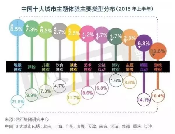 2016年上半年,场景体验类活动重拾“头把交椅”,其比重环比增长8.5个百分点至21.6%。根据盈石集团研究中心数据显示,在场景体验类活动中,超过20%均采用卡通或电影形象作为活动主题。此种方式不仅能吸引由儿童驱动的家庭消费群体,也能引入崇尚新鲜潮流的年轻群体,扩大购物中心对消费客群的辐射范围。而2015年表现优异的明星互动类活动继续“发威”位居第二,占比为14.1%。其中,明星多以电影见面会的形式与粉丝或消费者进行互动,其比重占全部明星互动类活动的31.4%。明星的出场对其粉丝的吸引程度非常可观,无论是本地粉丝还是从外地赶来的粉丝,均可以在短时间内为购物中心带来极高的人流,增加人气。
